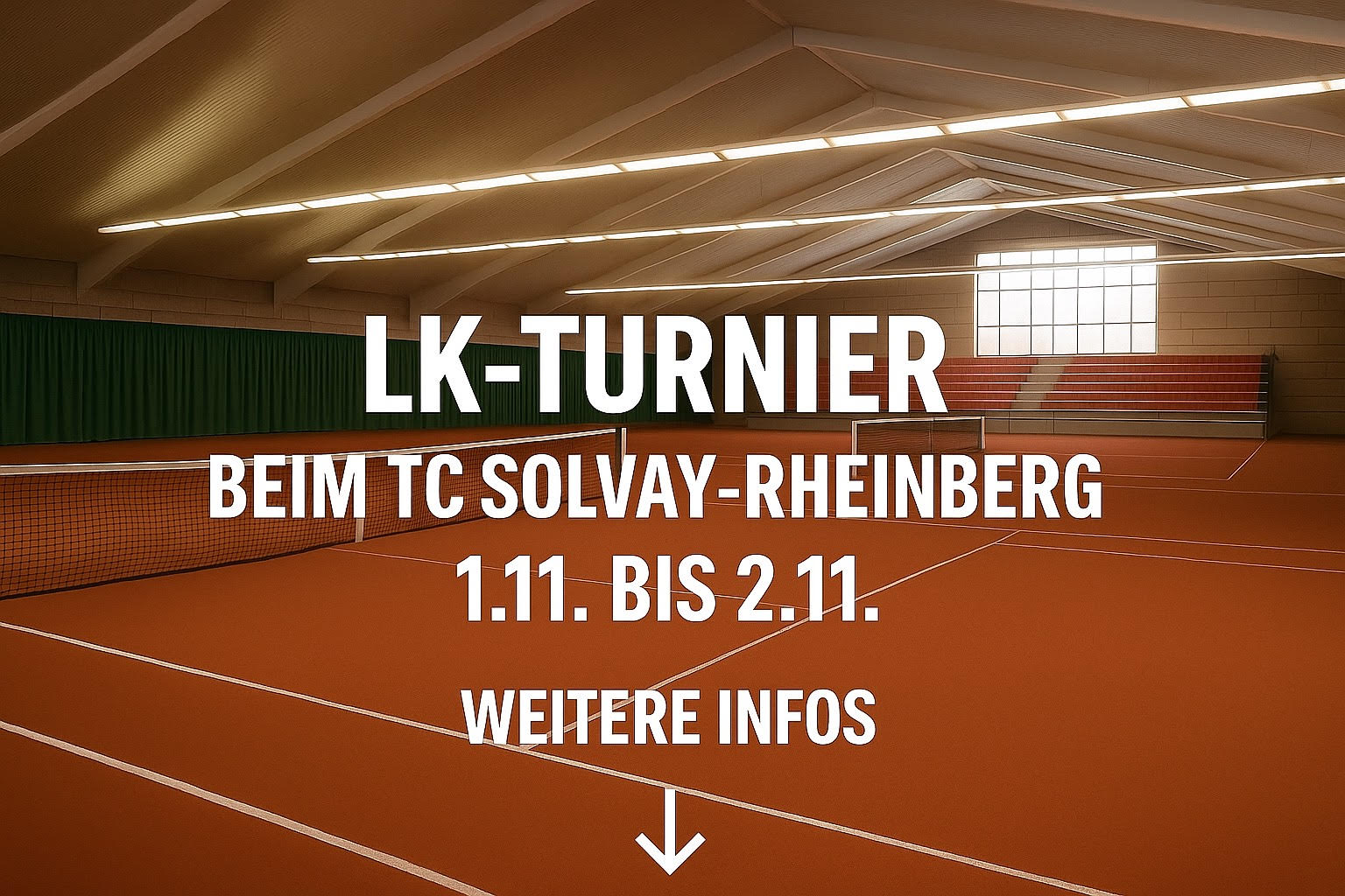 Vom 01.11. bis 02.11. findet beim TC Solvay Rheinberg ein spannendes LK-Turnier statt! Melde dich jetzt in einer der folgenden Konkurrenzen an:• Herren offen (H00)• Damen offen (D00)• Herren 30 (H30)• Damen 30 (D30)• Herren 40 (H40)• Damen 40 (D40)• Herren 50 (H50) • Damen 50 (D50)• Herren 55 (H55) Meldegebühr: 35 € zzgl. 5…